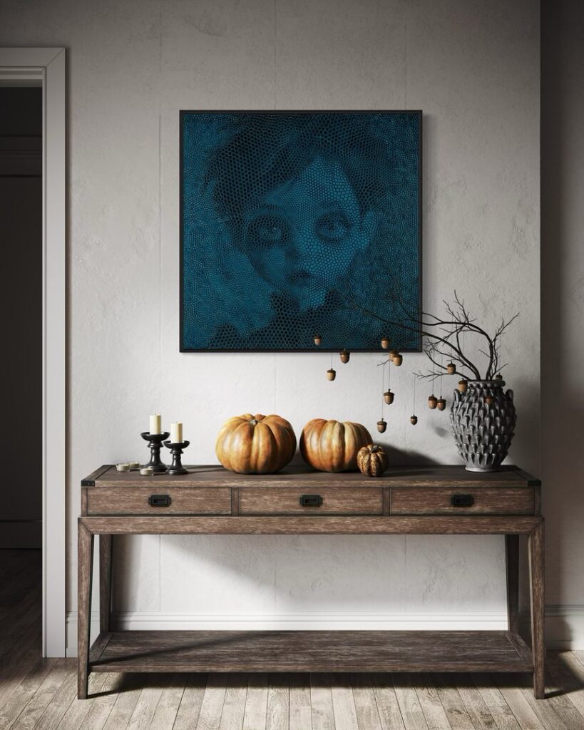A childlike face, simultaneously delicate and spectral, emerges from a lattice of dark teal and black. This visual tension evokes themes of identity and fragility in a digitized age.